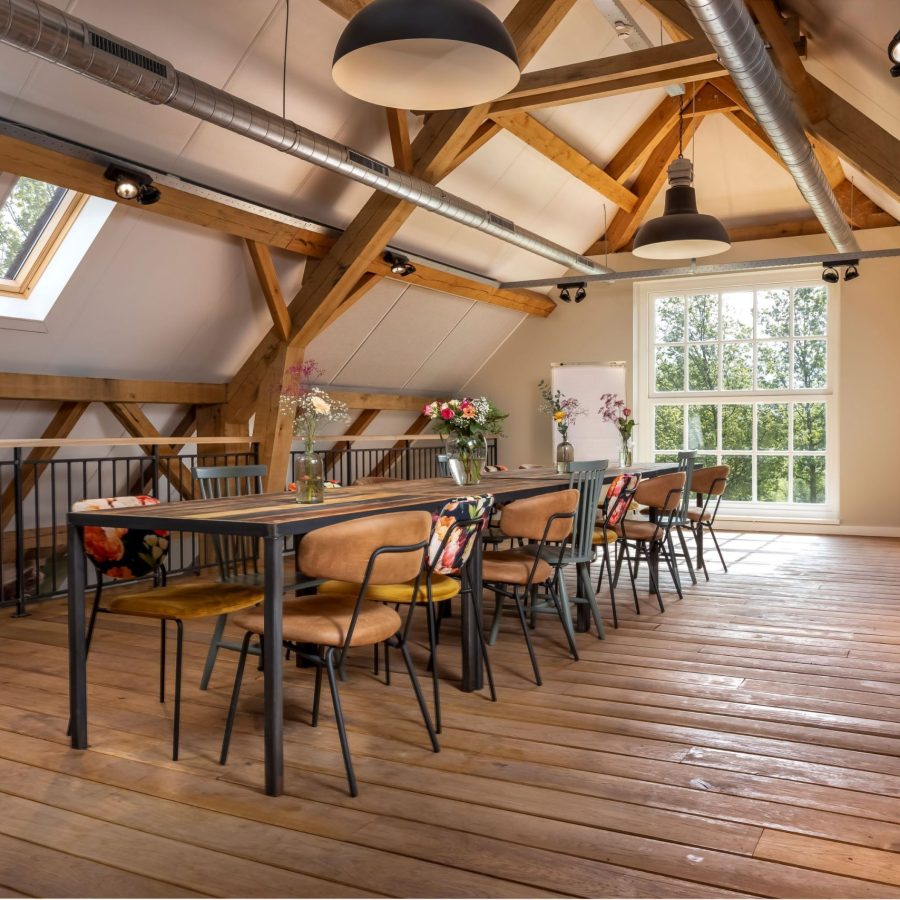 Naast onze prachtige Weidezaal en Kapel, hebben we ook de sfeervolle Weidezolder. Deze zolderruimte is perfect voor een ontspannen break-out sessie of een inspirerende start van de dag. Of trek je met een kop koffie in deze ruimte terug en bereid je in alle rust voor op wat er komen gaat. De knusse en informele setting maakt het gemakkelijk om je gedachten te ordenen en plannen te maken voor de rest van de dag.